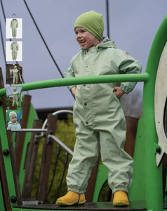 Regndressen er romslig i størrelsen – mål barnets høyde og velg størrelsen som er nærmest. For store klær kan redusere bevegelsesfriheten og føre til unødvendig slitasje. Modellene på bildene bruker størrelse 104.